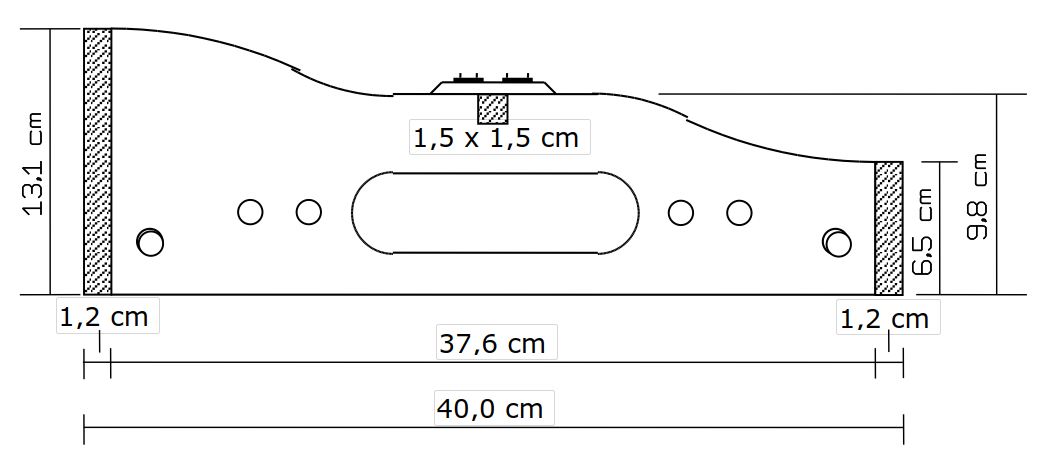 Das Modulendstück bildet nicht die Gesamtbreite eines Moduls, sondern wird zwischen Vorder- und Rückseite eingelassen, damit kein Hirnholz sichtbar wird. Das Modulendstück wurde weitgehend an das FREMO-Endstück in Bezug auf Schienenoberkante (SOK), Gleisabstand und Verbindungsbohrungen angepasst.