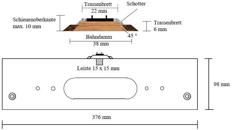 Die oberen 2 mm des MFZ-Trassenbrettes stimmen mit dem Schotterbett des Vorbildes überein. Ein realistischer Bahndamm verbreitert sich dann auf 6,25 cm. Um einen realitätsnahen Bahndamm zu gestalten, kann unter den Gleisen eine 4,6 cm breite und 2 mm dicke Korkschicht verlegt werden. Darunter befindet sich der eigentliche Bahndamm. Dafür verwendet man Sperrholzbrett in der gewünschten Bahndammhöhe, dessen Breite auf der Oberseite die genannten 6,25 cm beträgt. Nach außen wird es mit der Stichsäge im Winkel von 45 ° abgeschrägt.